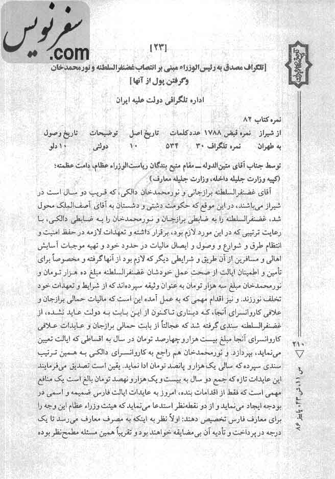 در حال مطالعه در کتابخانه ملی سندی را دیدم که کلی لذت بخش بود ، تلگراف مصدق به رئیس الوزرا مبنی بر انتصاب غضنفر السطنه و نورمحمدخان ، حال چرا این تلگراف جالب بود … مقررشده بود نورمحمد خان که ضابط وقت دالکی بوده و سه هزار تومان هم بابت وثیقه داده است تاکنون مالیات حمالی بار به برازجان و علافی کاروانسرای دالکی را پرداخت نکرده است. مبلغ مالیات و علافی کاروانسرای دالکی 24400 تومان بوده که مقرر شده بود سالیانه پرداخت شود که نشده بود.