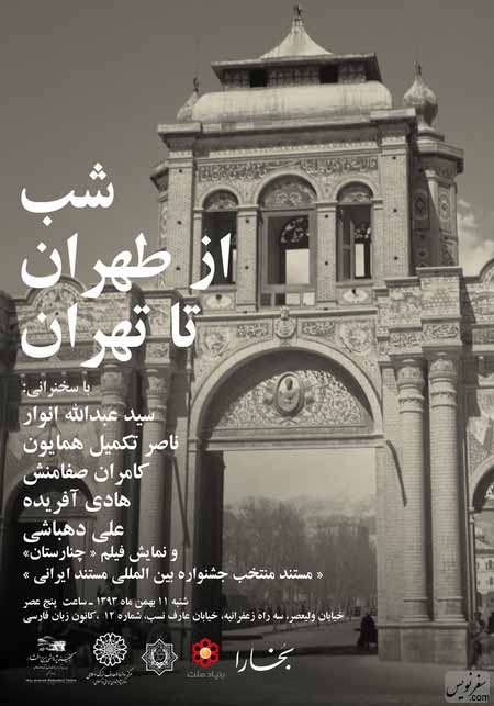 مجله بخارا با همکاری بنیاد فرهنگی اجتماعی ملت، مرکزدائره العمارف بزرگ اسلامی، بنیاد موقوفات دکتر محمود افشار و گنجنیه پژوهشی ایرج افشار شب «از طهران تا تهران» را برگزار می نماید.  در این شب استاد سید عبدالله انوار درباره باغ‎های تهران، دکتر ناصرتکمیل همایون درباره اودالاجان و مهندس کامران صفامنش درباره ساختار معماری تهران سخن خواهند گفت و فیلم  مستند «چنارستان» ساخته هادی آفریده پخش می شود که به تاریخچه خیابان ولیعصر می پردازد.