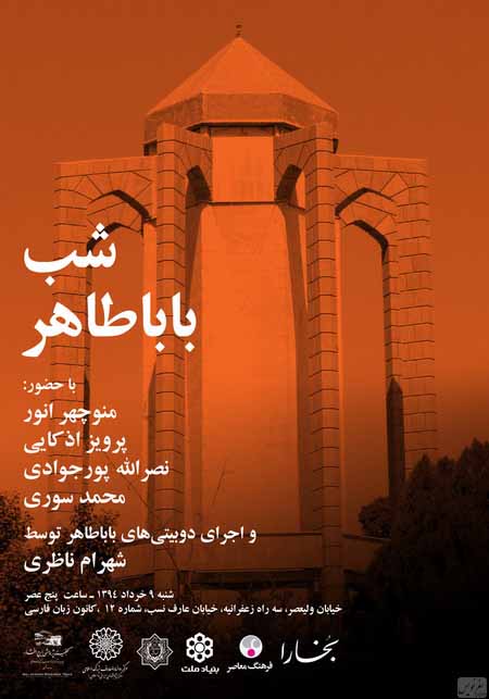 به مناسبت انتشار کتاب بابا طاهر تالیف دکتر نصرالله پورجوادی شب بابا طاهر برگزار می شود. در این مراسم دکتر پرویز اذکایی درباره زندگی و آثار بابا طاهر سخن می گوید، دکتر پورجوادی درباره بابا طاهر دز تصوف و عرفان ایرانی، دکتر محمد سوری درباره شاگردان بابا طاهر سخن خواهند گفت و منوچهر انور نیز گزیده ای از دوبیتی های بابا طاهر را می خواند. سپس مراسم رونمایی از کتاب بابا طاهر انجام می شود و در پایان استاد شهرام ناظری قطعاتی از سروده های بابا طاهر را اجرا خواهد کرد.