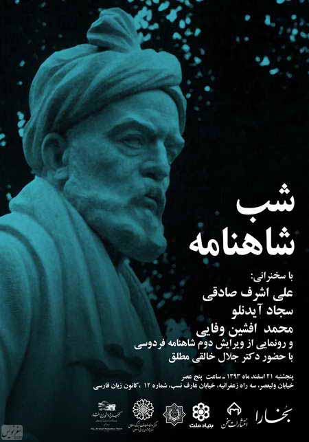 شب شاهنامه با حضور دکتر جلال خالقی مطلق و به همت مجله بخارا برگزار می شود، در شب شاهنامه دکتر علی اشرف صادقی، سجاد آیدنلو و محمد افشین وفایی سخن خواهند گفت و دکتر جلال خالقی مطلق نیز در این رونمایی حضور دارد تا با دوستداران خود دیدار کند…