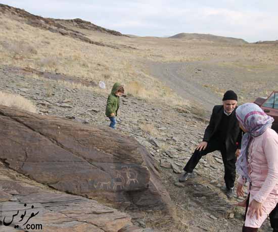 پدر با نوه ها کنار سنگ نگارهای تپه غرقاب گلپایگان