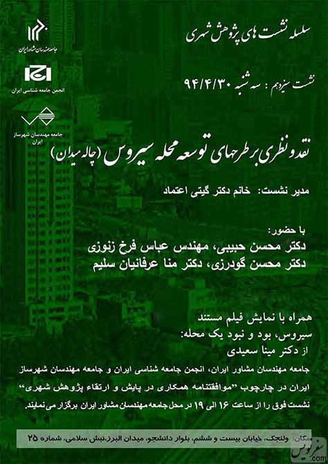 جامعه مهندسان مشاور ایران با همکاری انجمن جامعه شناسی ایران، در سیزدهمین نشست پژوهش شهری نشستی را برگزار می کنند درخصوص؛ نقد و نظری بر طرحهای توسعه محله سيروس (چاله ميدان)، در این نشست فیلم مستند «سيروس، بود و نبود يك محله»، به کارگردانی مينا سعيدی به نمایش در می آید.