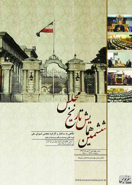ششمین همایش تاریخ مجلس با موضوع «نگاهی به ساختار و کارکرد مجلس شورای ملی در دوره‌ها‌ی بیست و یکم و بیست و دوم» در عمارت زیبا و قدیمی مجلس شورای ملی، تالار شهید مدرس برگزار می‌گردد و حضور عموم علاقه‌مندان در این همایش بلا مانع است.